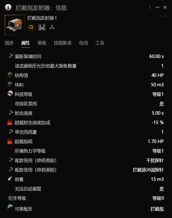 拦截泡发射器,一件只能由轻拦携带的高槽装备,也是轻拦的标志。其作用是装填并发 射两种干扰探针,达到限制敌方跃迁/机动的效果。此装备只能同时装配 1 个,超载效果为 降低发射间隔。需要注意的是,拦截泡发射器有长达 1 分钟的装填时间。
