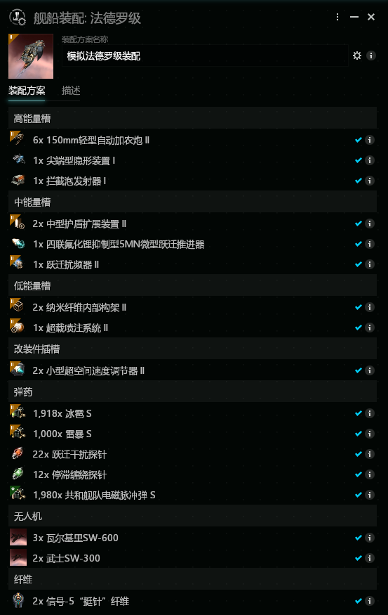 中槽的抑制型微曲和短反为必备,多余的槽位用做防御。其中抑制微曲为必备,这样可以使法德罗的信号半径减小到最佳理想水平